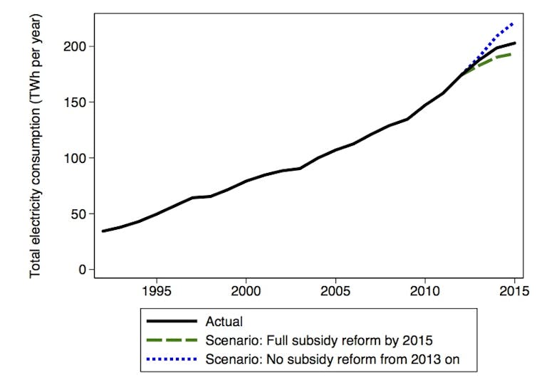 Our estimates suggest that, as of 2015, cuts in electricity subsidies reduced annual electricity use by around 7% relative to the scenario of no reform.